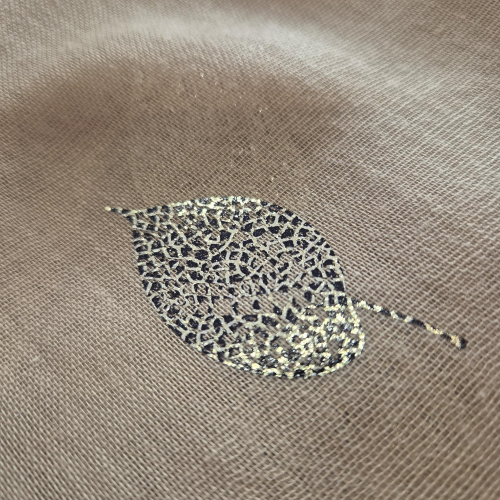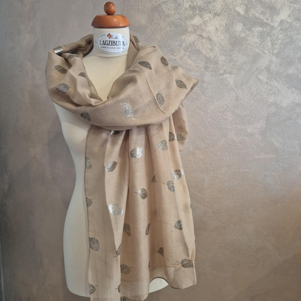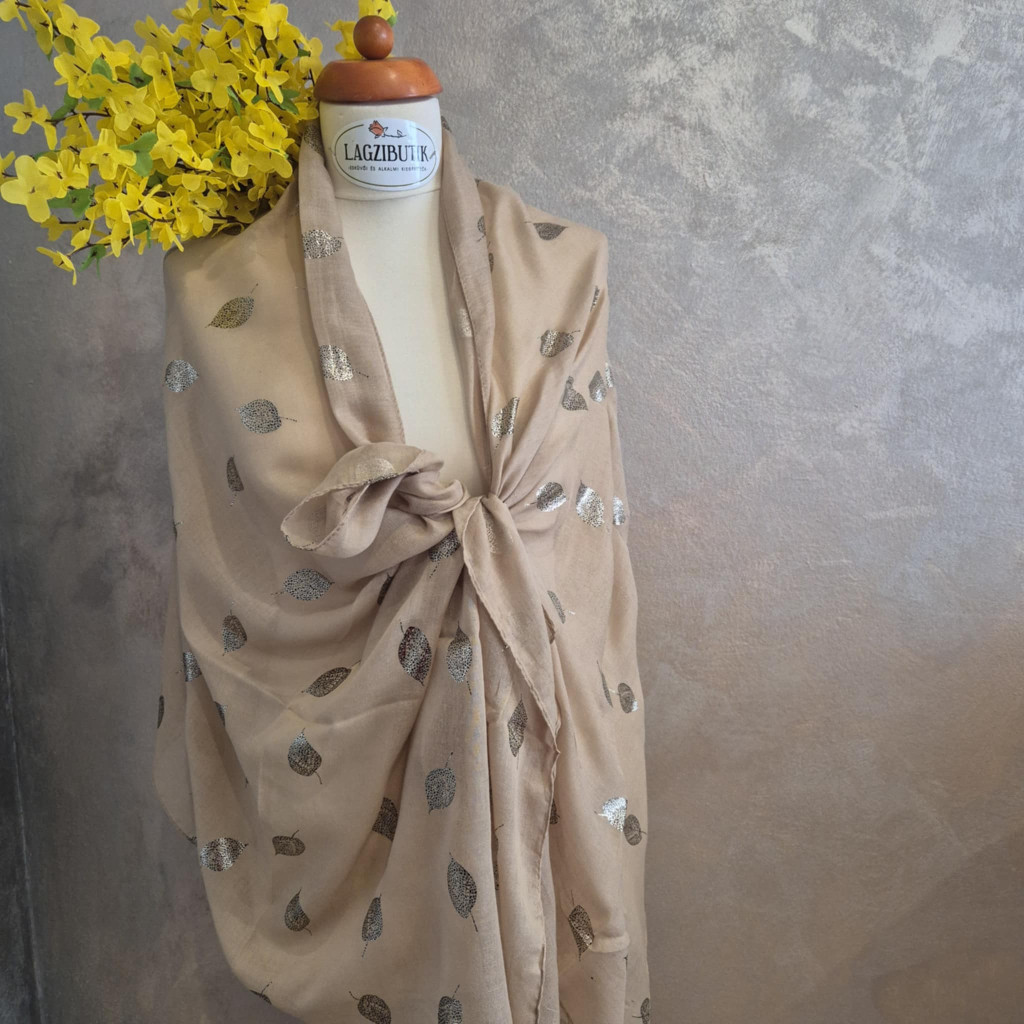 Fényes, apró arany leveles vékony stóla, vállkendő. Puha tapintású, semleges színű kiegészítő. Többféleképpen viselhető alap darab.