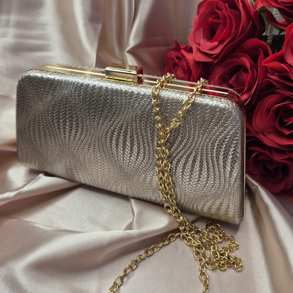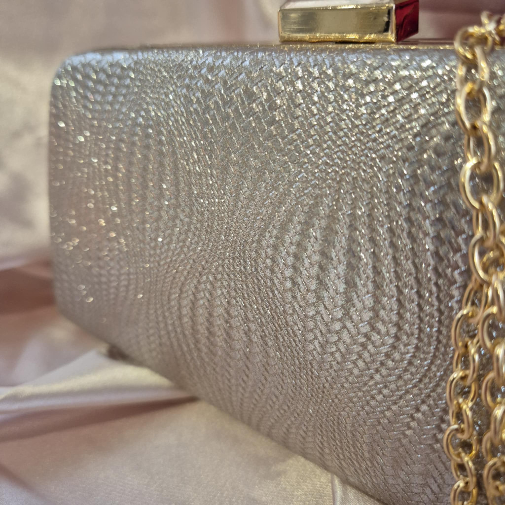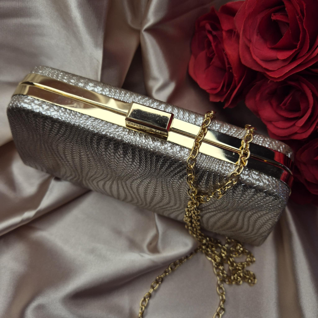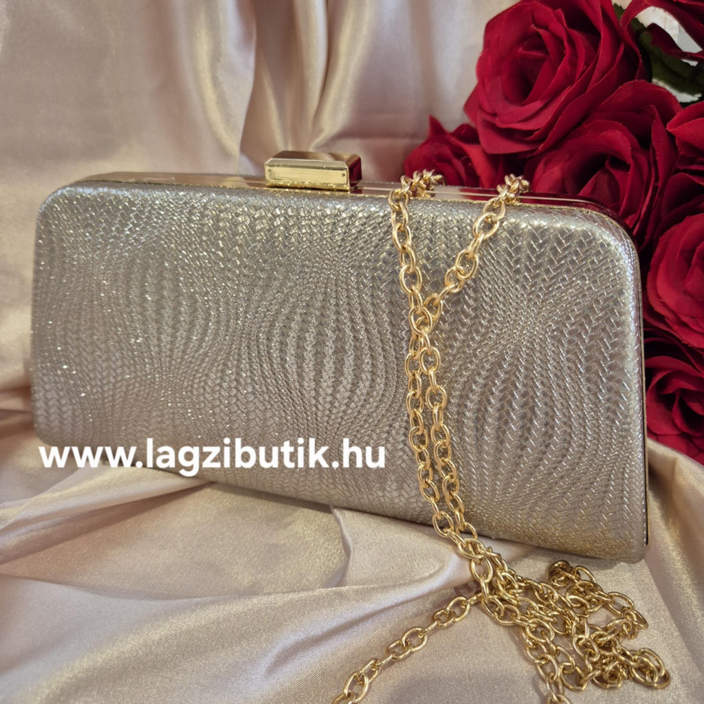 Fémesen csillogó, nyomott mintás luxus alkalmi táska. Arany színű lánccal, vagy anélkül, kézben is viselhető, belül selyemmel bélelt.