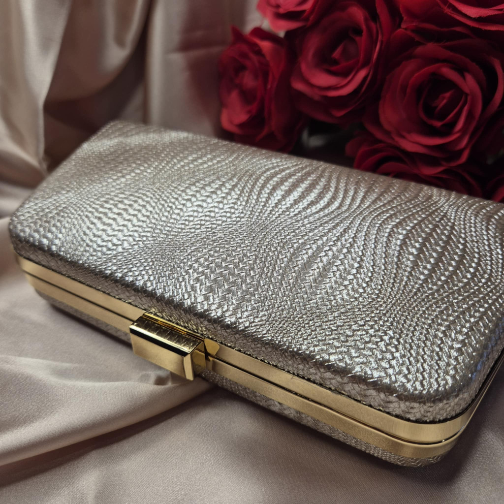 Arany alkalmi táska, nyomott mintával.