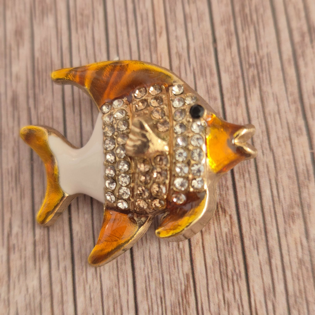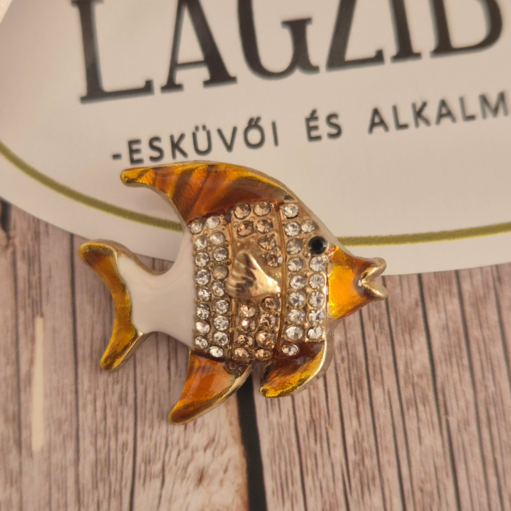 Csillogó strasszokkal kirakott hal bross. Szép arany színű, mutatós kiegészítő.