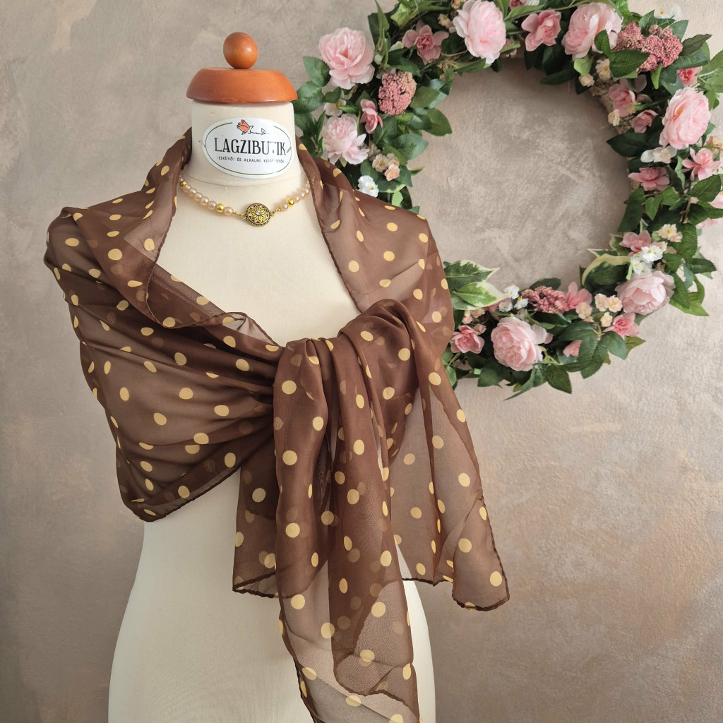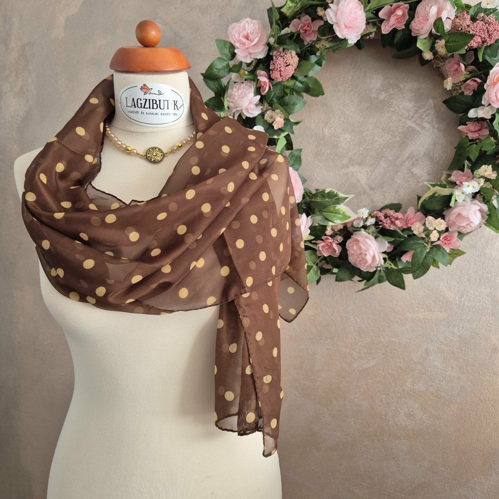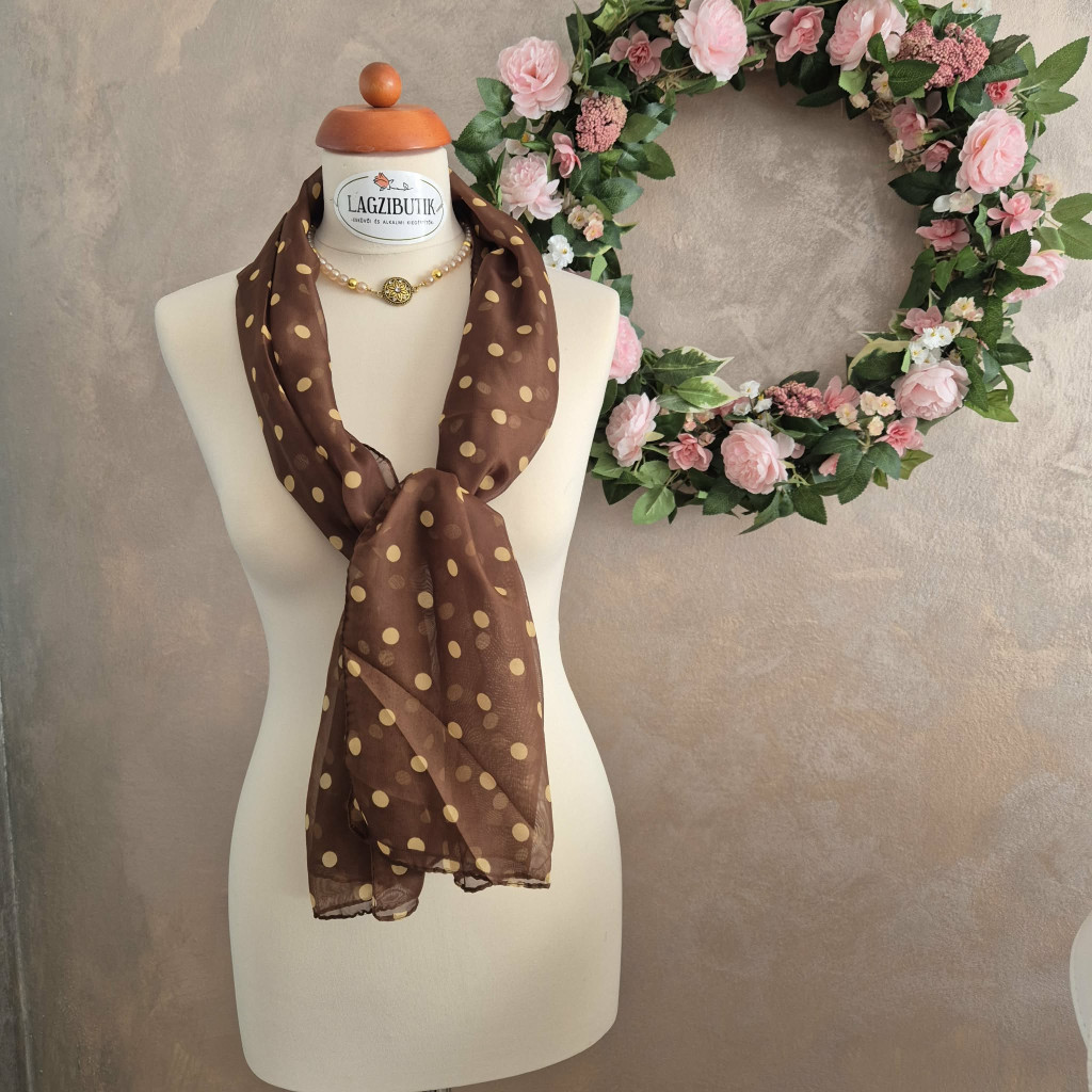 Hosszú kendő, csokibarna-bézs pöttyös. Nagyon mutatós, jól kihasználható alap darab. Keskeny stólaként is viselhető, de hajban, nyakban, övként, táskán