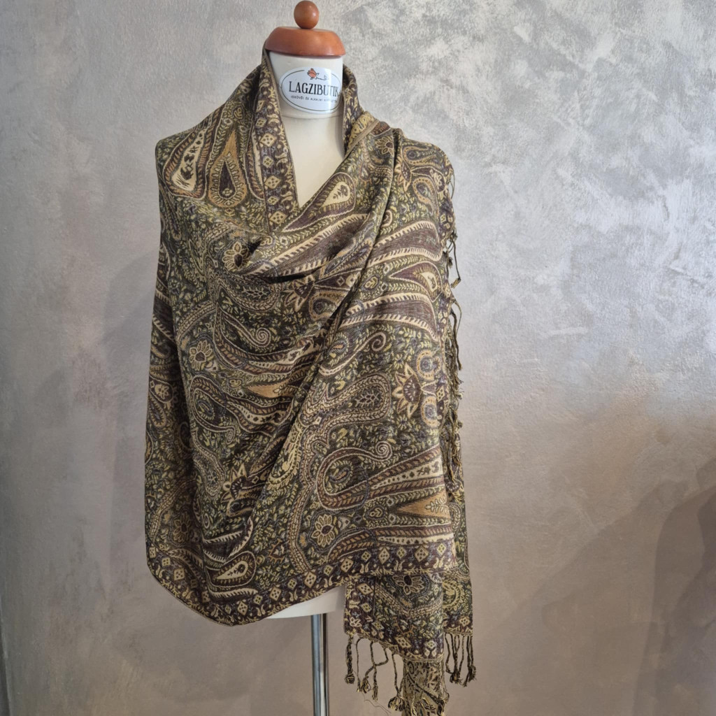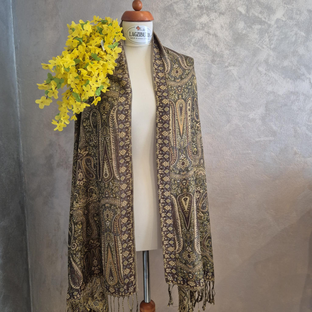 Sűrű mintás, barna színű középvastag stóla, vállkendő. Puha, kellemes tapintású, szélén rojtos kiegészítő.