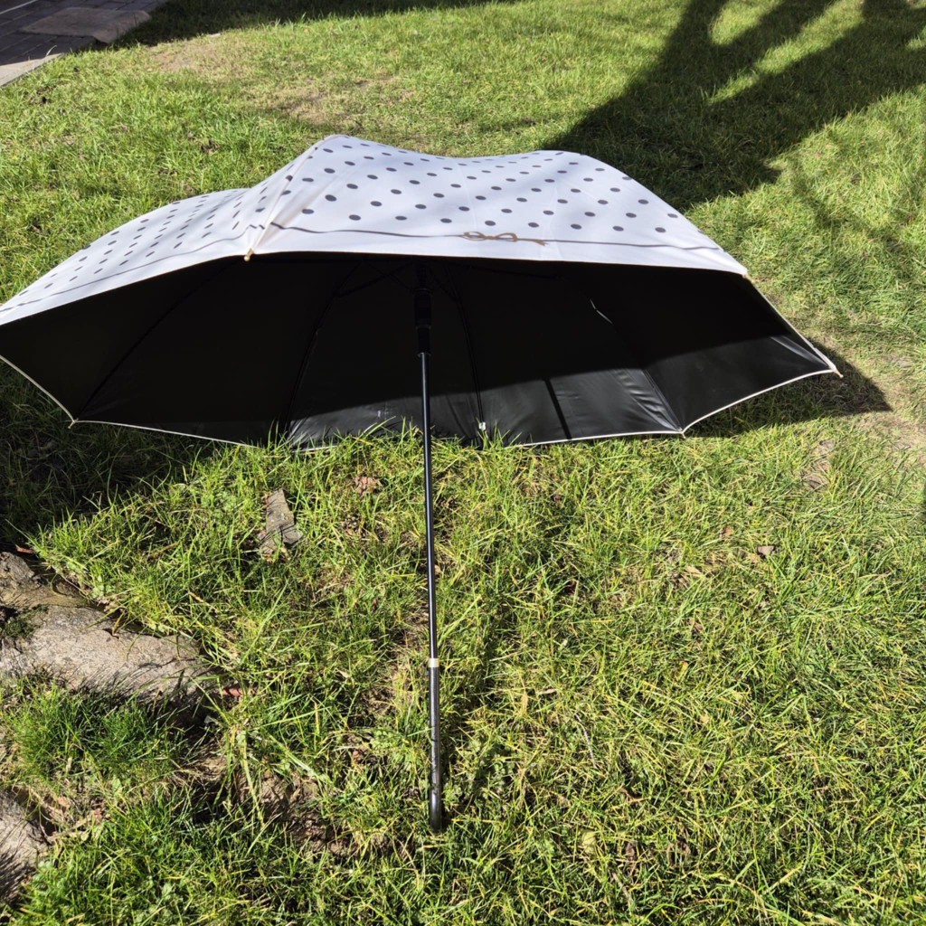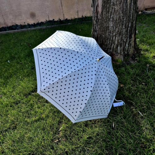 Fehér, fekete pöttyös automata esernyő.