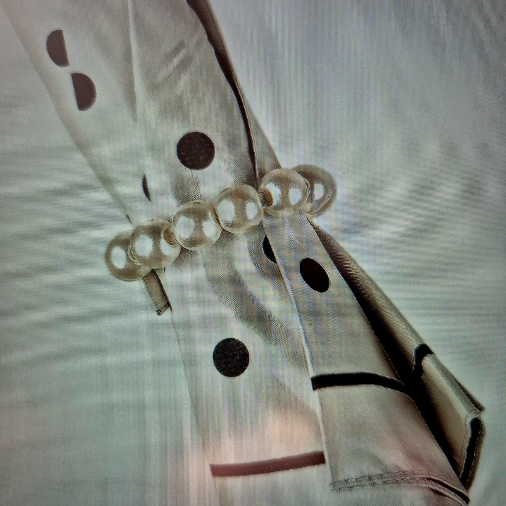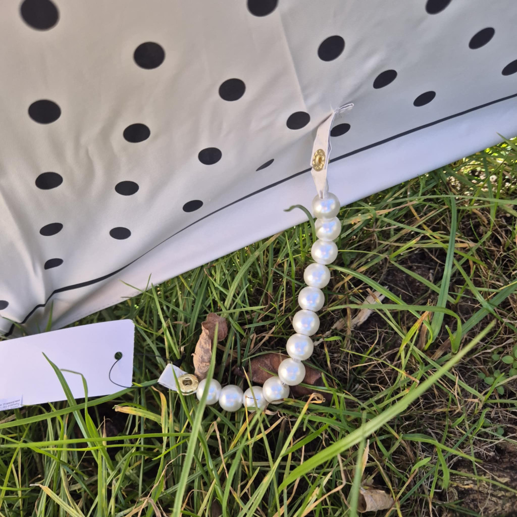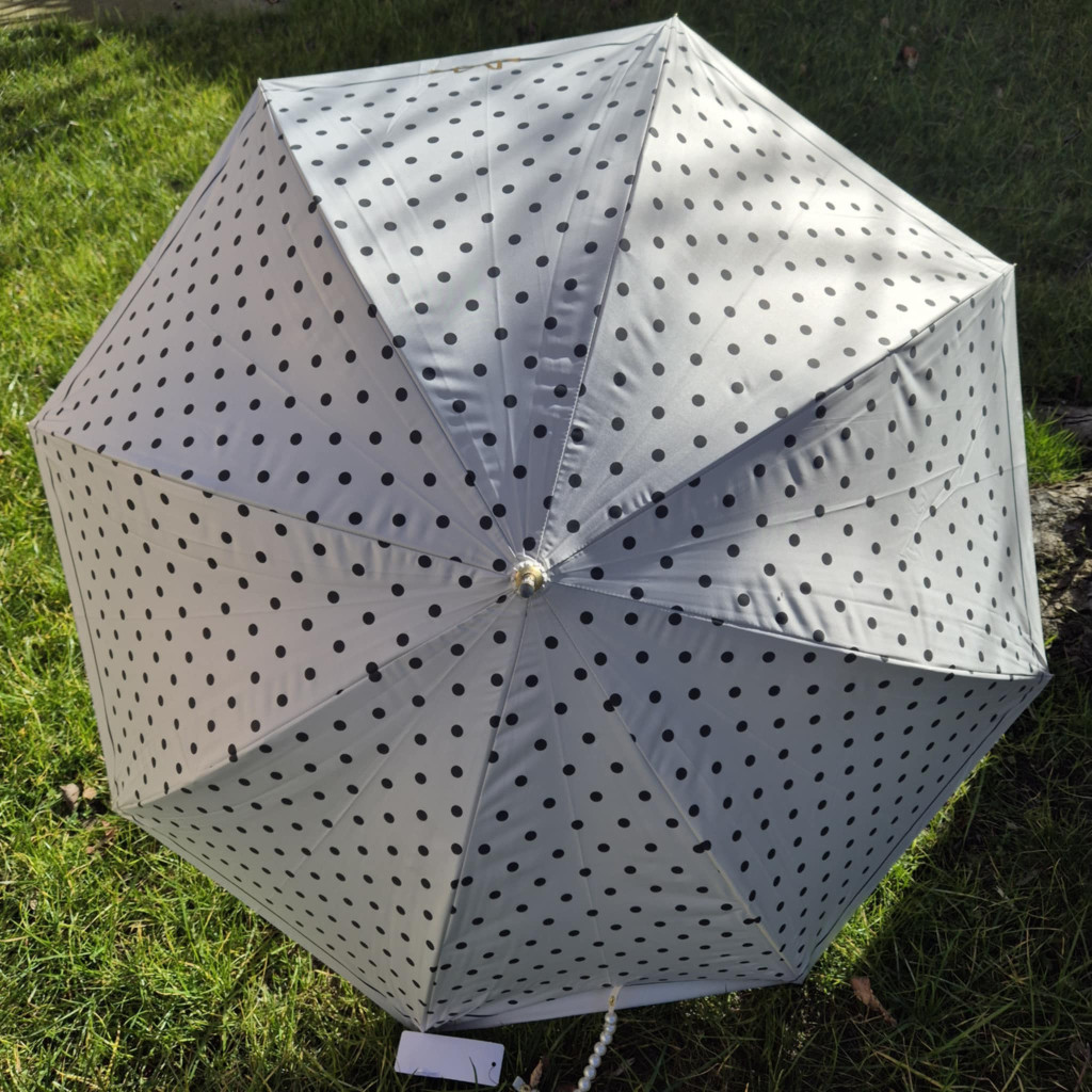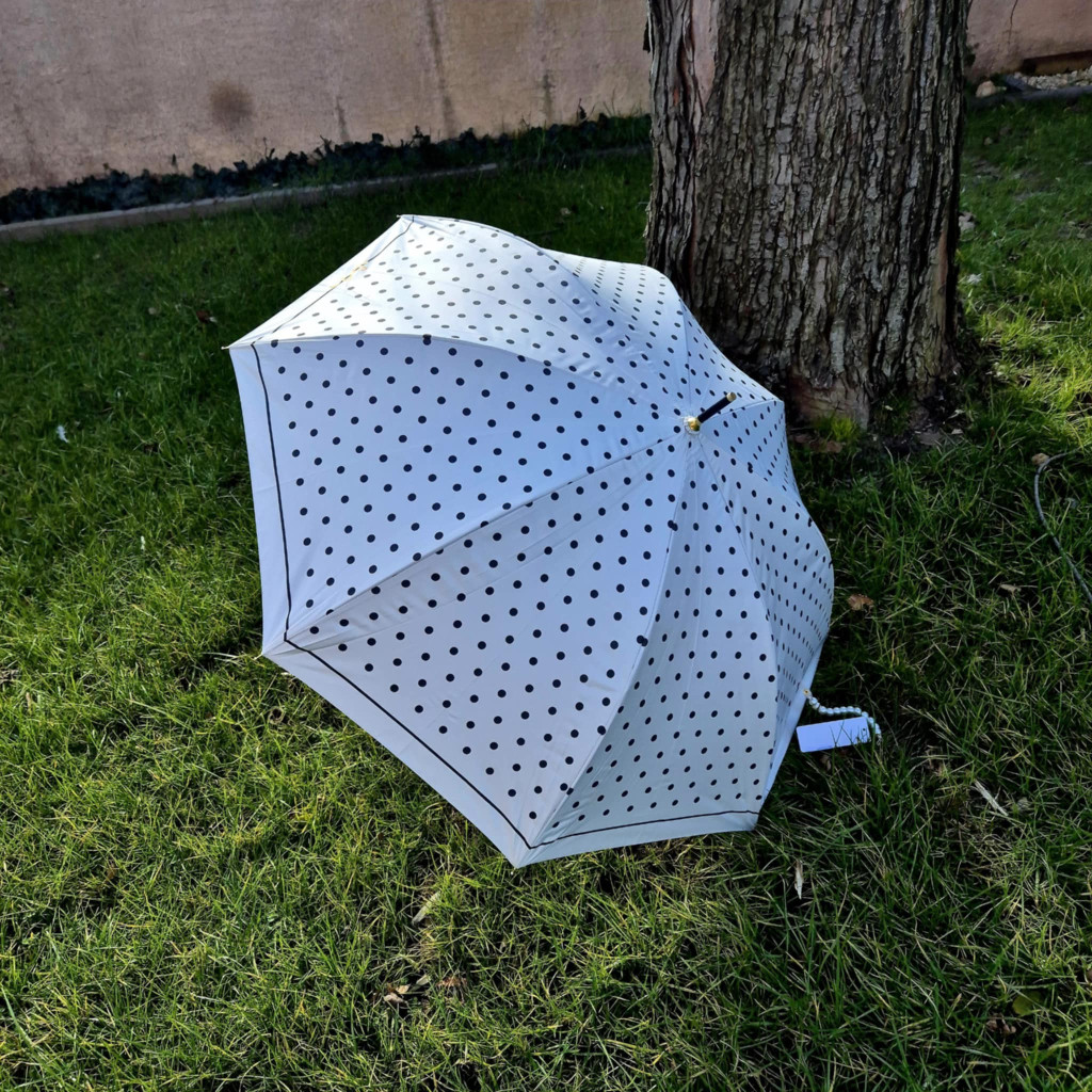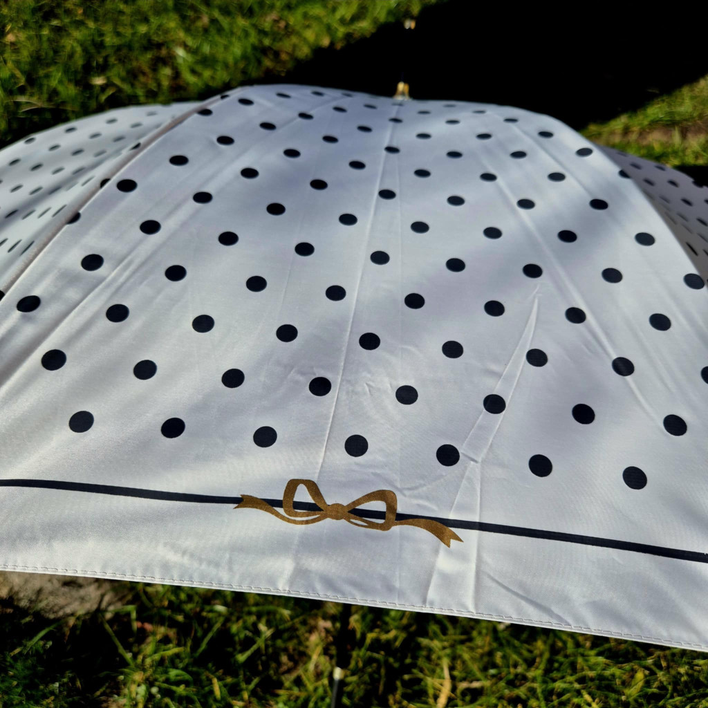 Rendkívül elegáns törtfehér esernyő, fekete, apró pöttyökkel. Automatikusan nyitható, nőies, romantikus részletekkel. Elején arany színű nyomott masni