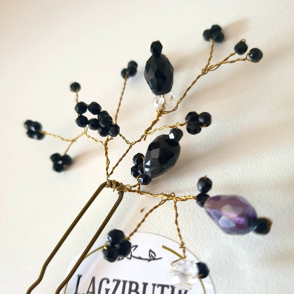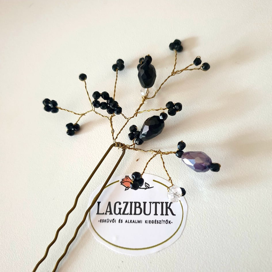Fekete, üveggyöngyös hosszú hajtű, hajékszer. Alkalmi, elegáns, csillogó. Nem hivalkodó, finom betűző alkalmi frizurákba. Teljes hossza kb. 14 cm.