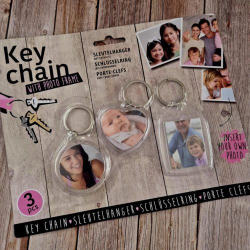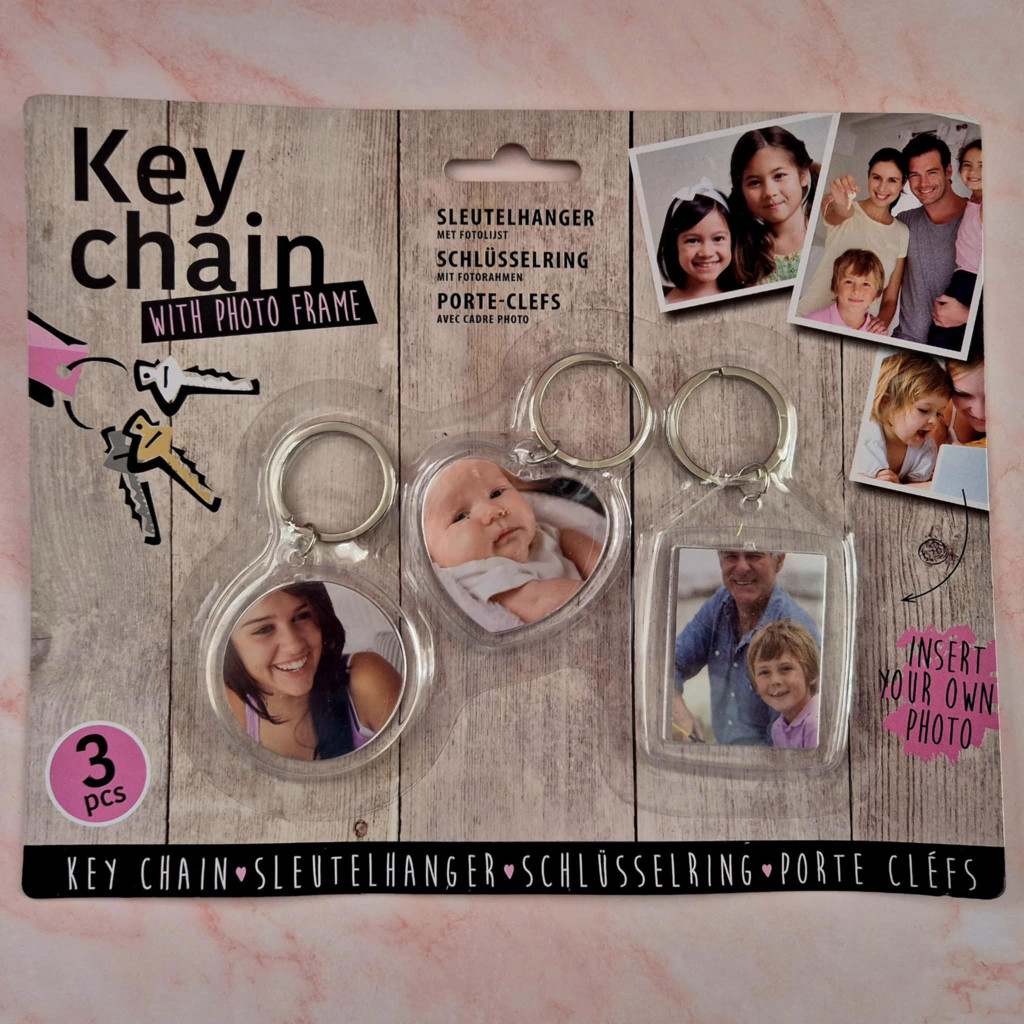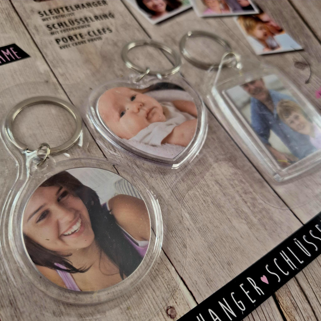 3 különböző alakú, nyitható, fényképpel tölthető kulcstartó-szett.