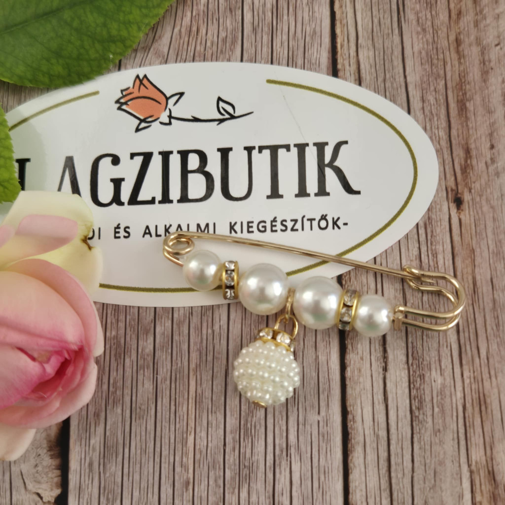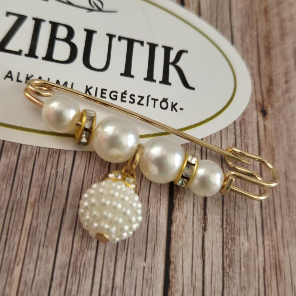 Törtfehér gyöngyös sáltű, strasszokkal, és egy szem lógós dísszel. Praktikus darab, öltözékkiegészítő ruhákhoz, sálakhoz, dekoltázshoz, ruhabőség szabályozásához.