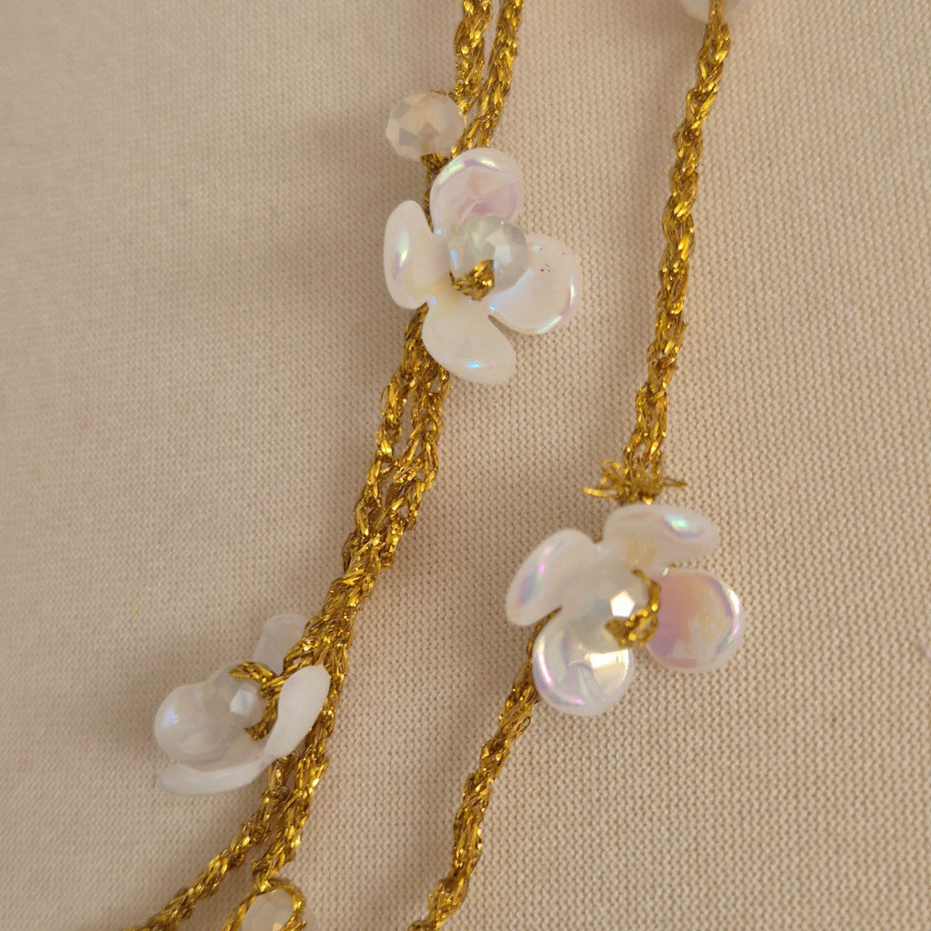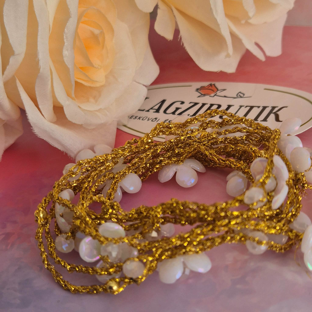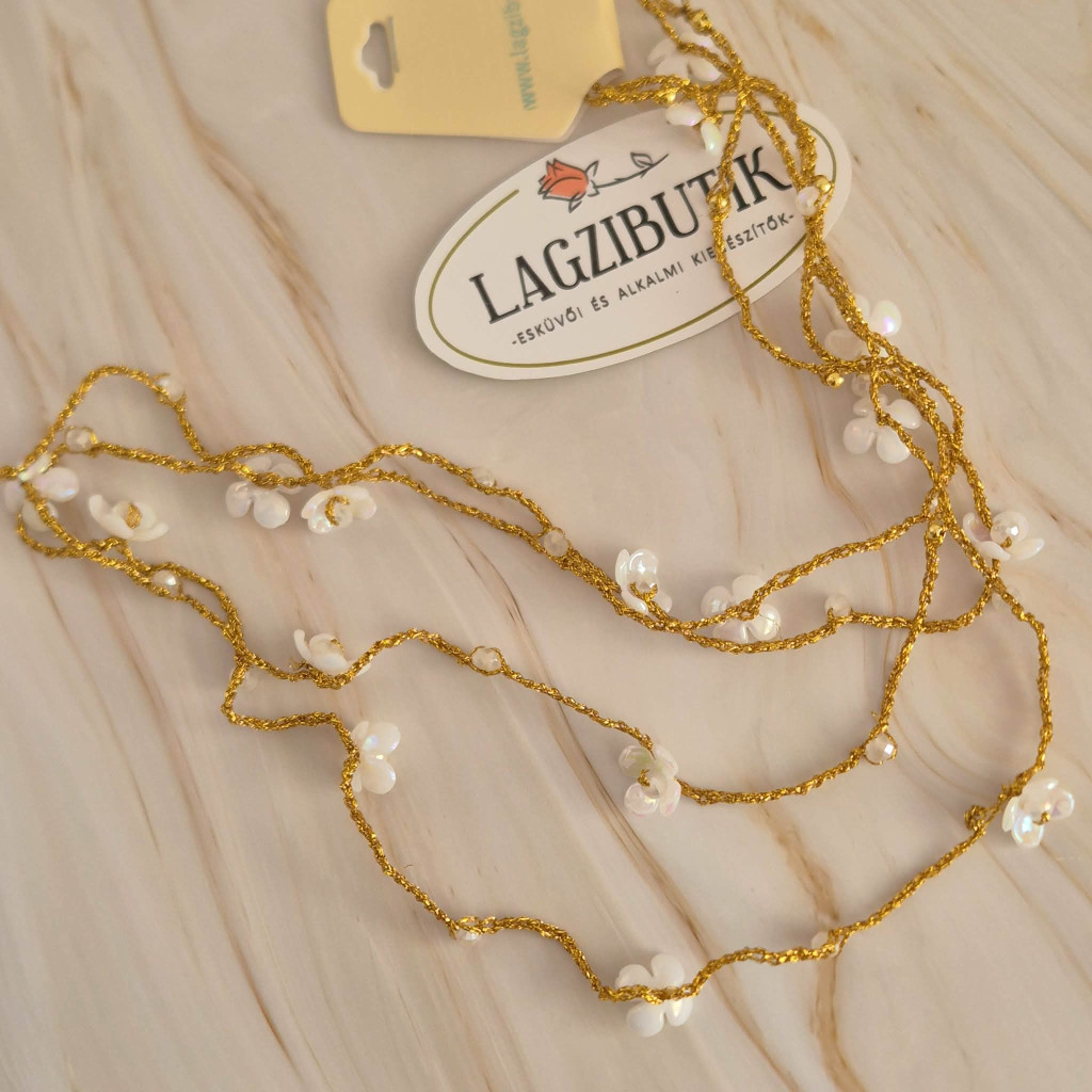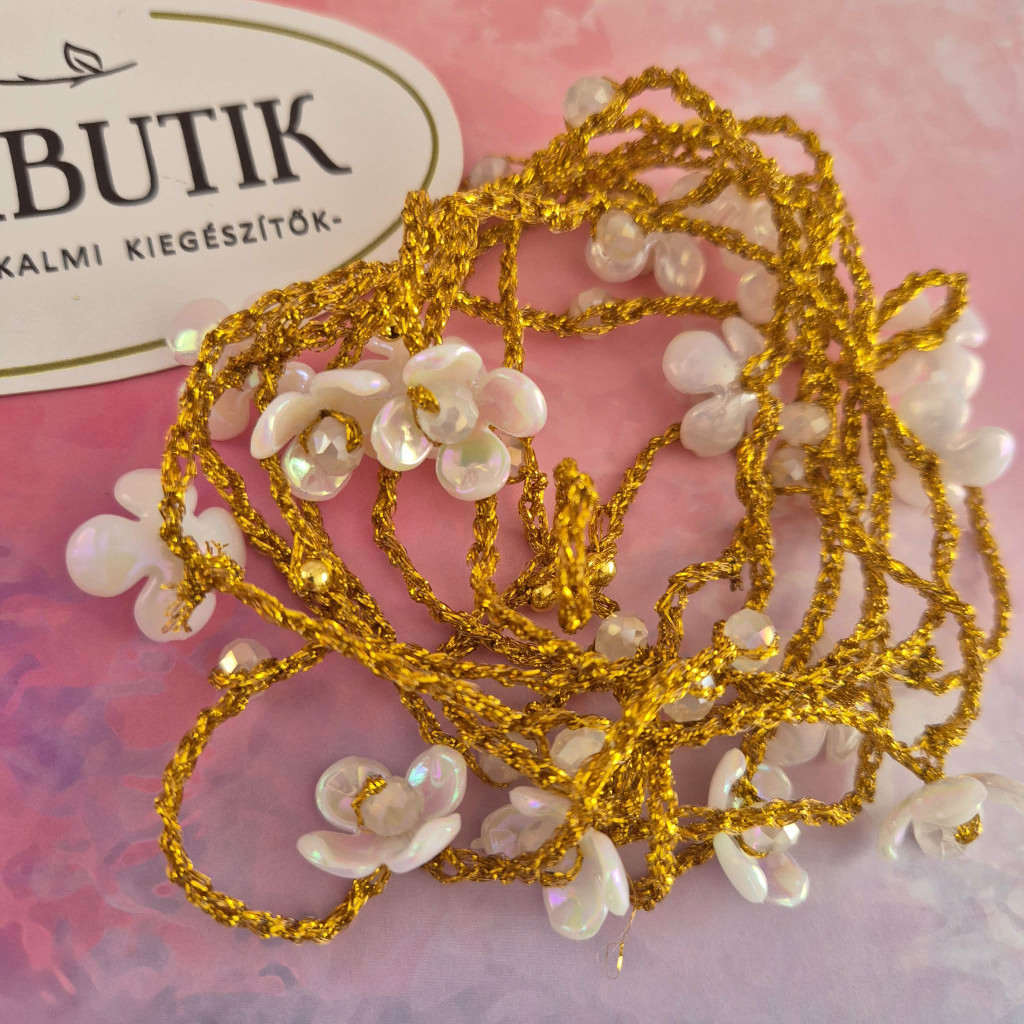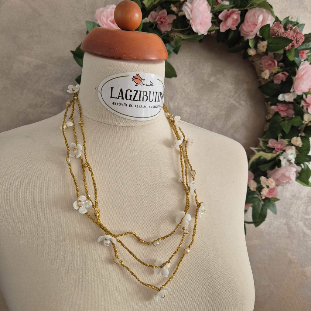 Egyedi nyaklánc arany színű horgolt, fehér virágokkal. A virágok közepe csiszolt gyöngy, fényesen csillogó. A nyaklánc teljes hossza kb. 1 méter.