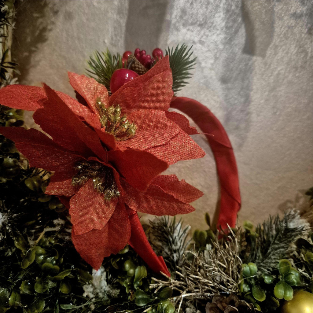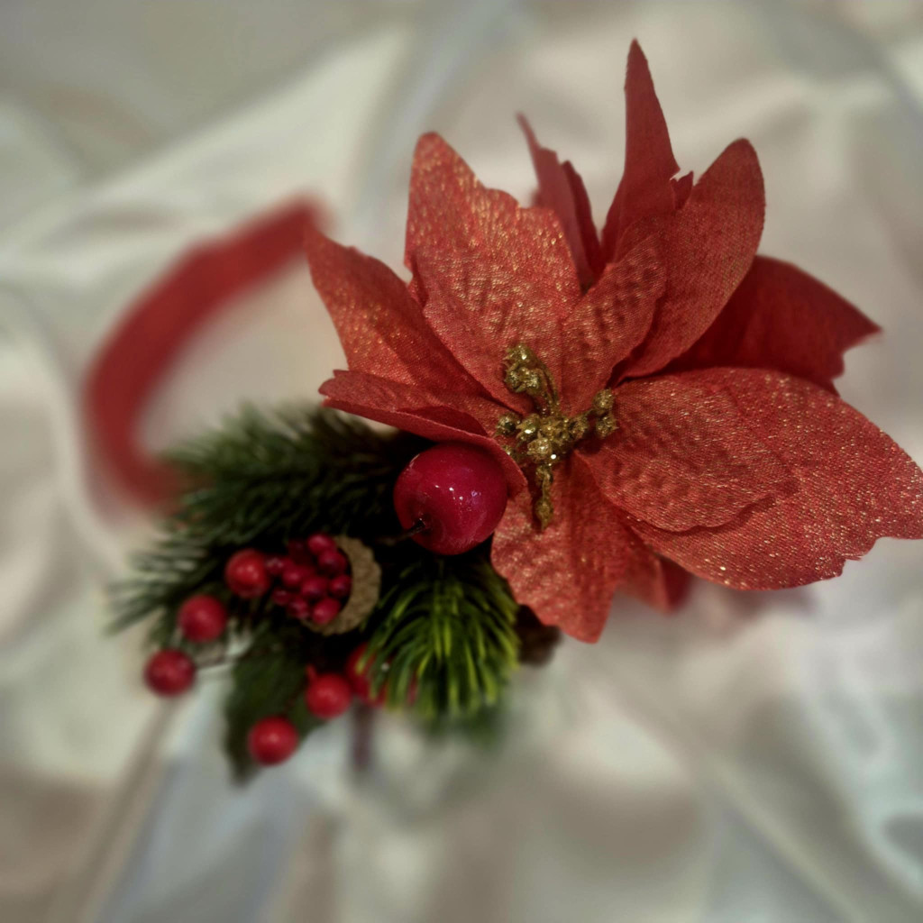 Különleges, egyedi hajpánt mikulásvirágokkal, fenyőággal. Egyedi tervezésű, az ELIROSE kollekció része.