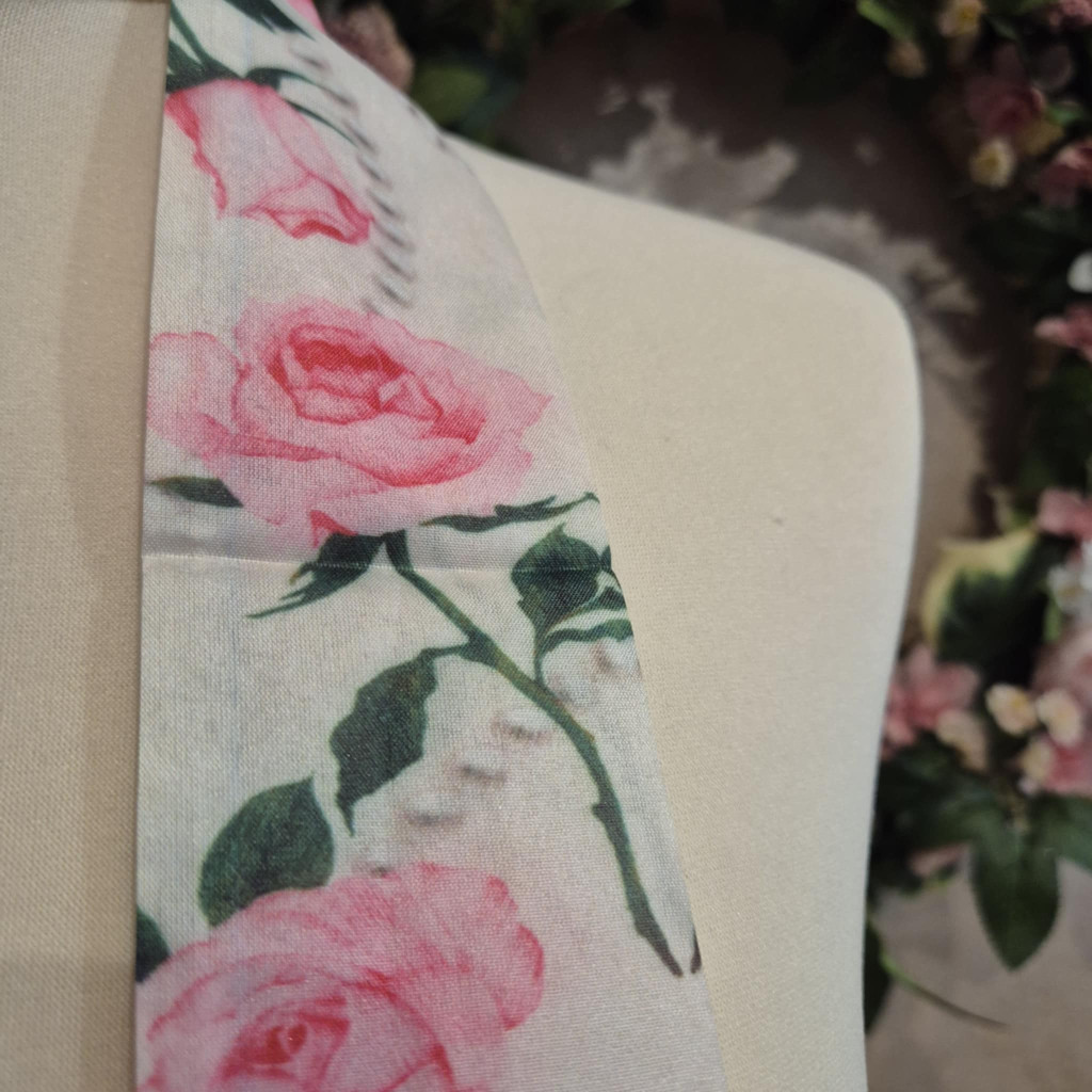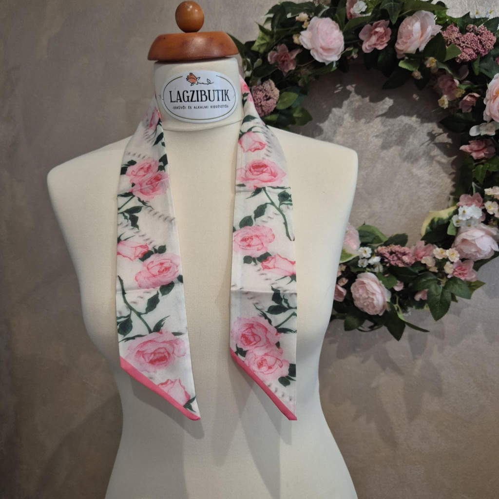 Rózsás, romantikus selyemszalag. Keskeny, hosszú, hajpántként, hajba fonva, nyakon, táskán, csuklóra tekerve stb. is viselhető.