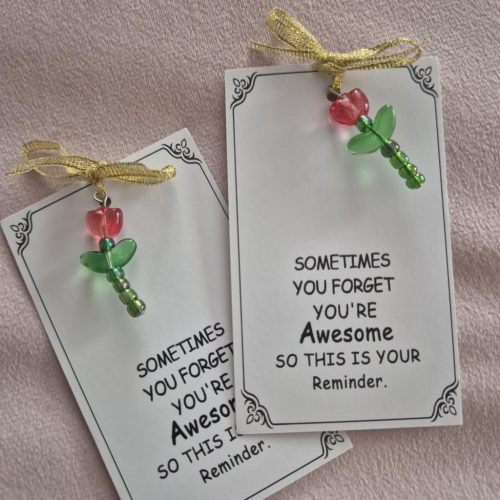 Gyöngyökből készült piros tulipán függődísz, motivációs kártyán.