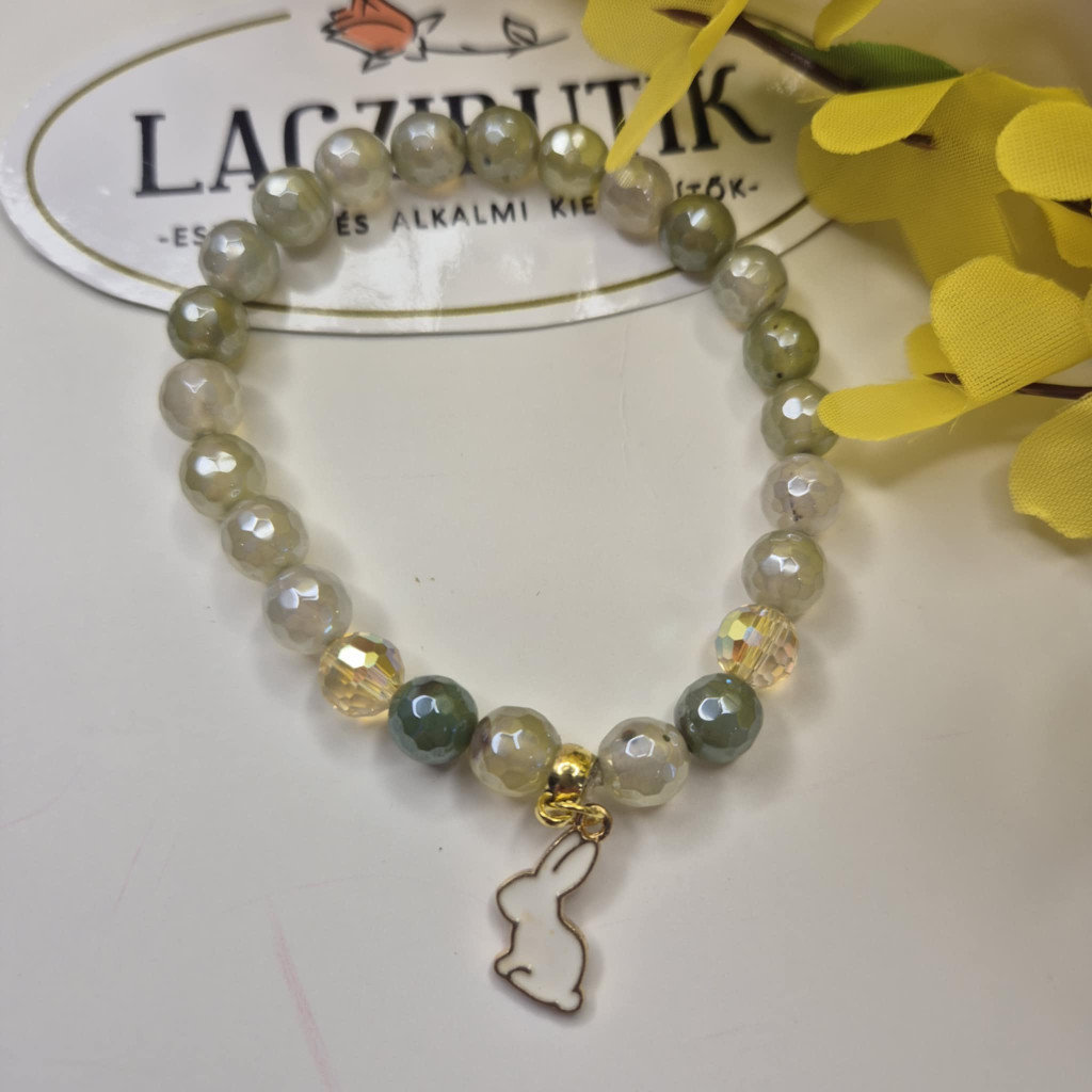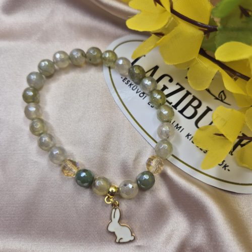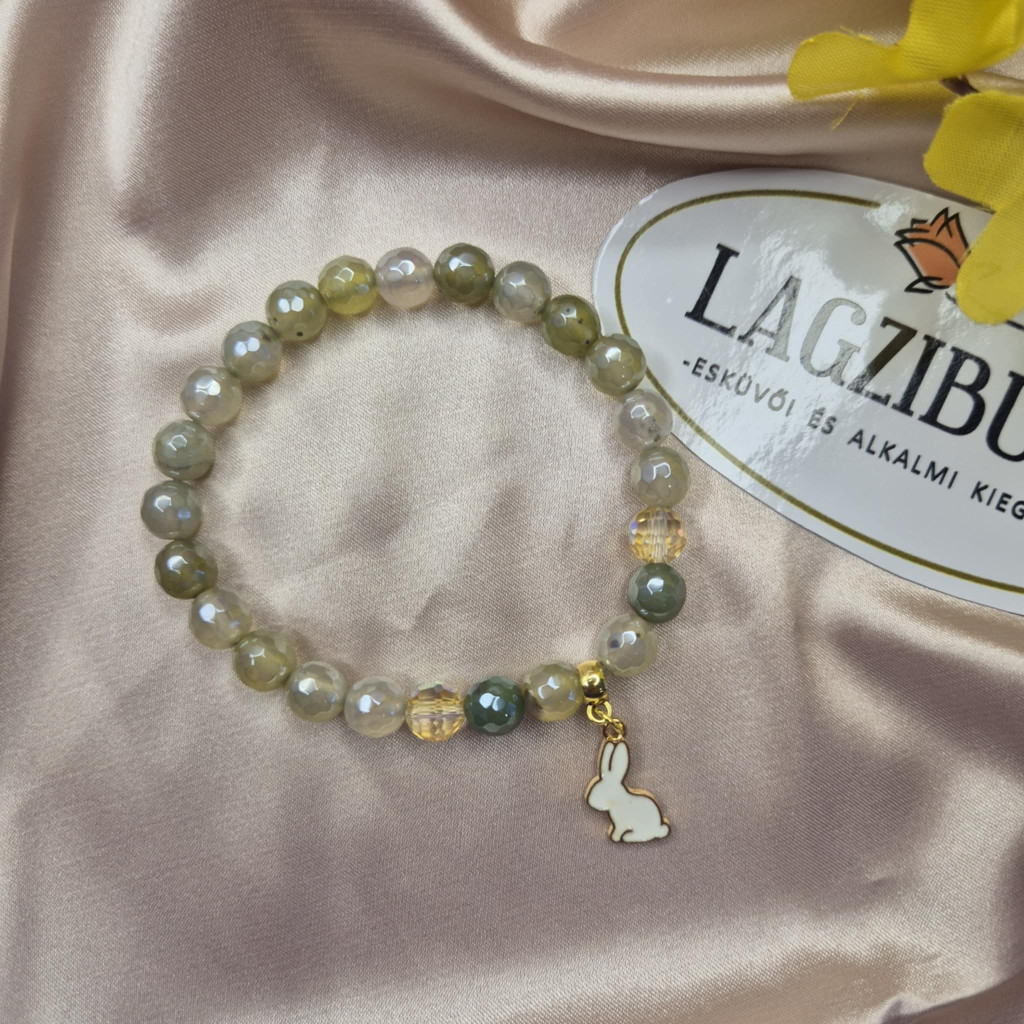 Fehér nyuszi medálos, zöldes sárgás fényes achát gyöngyökből készített karkötő, csiszolt kristályokkal.