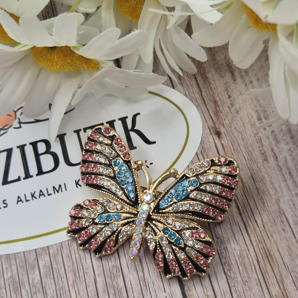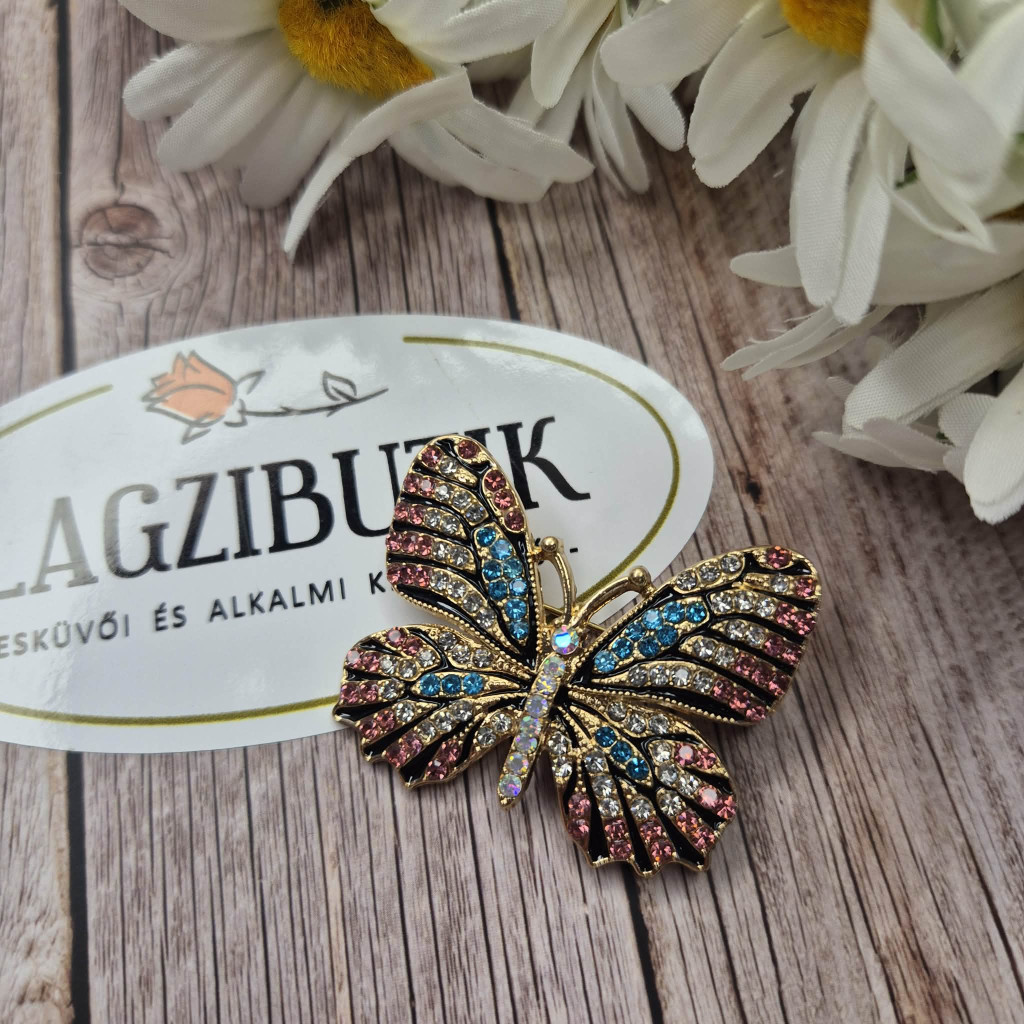 Csillogó, színes kövekkel kirakott pillangó bross. Gyönyörűen sziporkázik a fényben, bármihez viselhető darab.