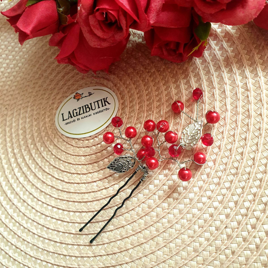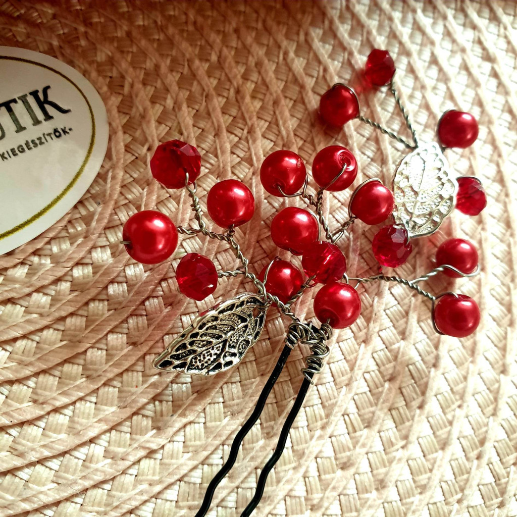 Piros, teklagyöngy és csiszolt üveggyöngy felhasználásával készült hajtű, betűző, hajékszer.