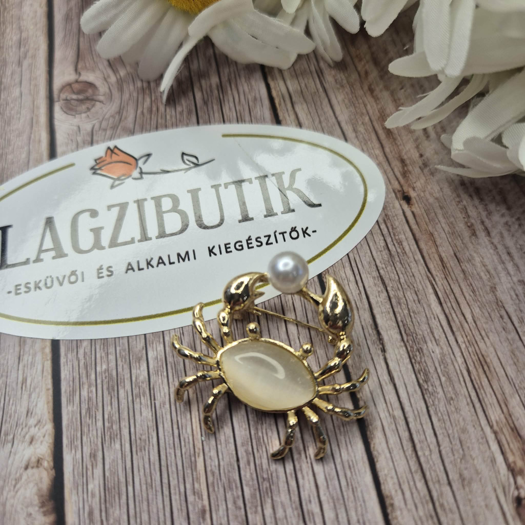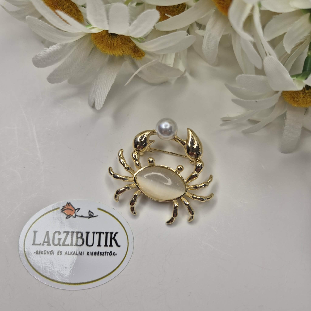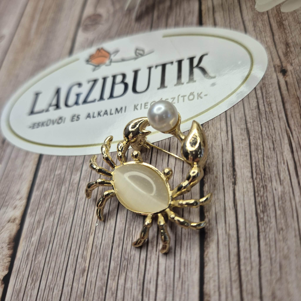 Arany színű rák kitűző, nagy opál kővel, gyönggyel. Mutatós, különleges darab, ami jól mutat ruhán, kabáton, blézeren, pulóveren, sálon..bármin.
