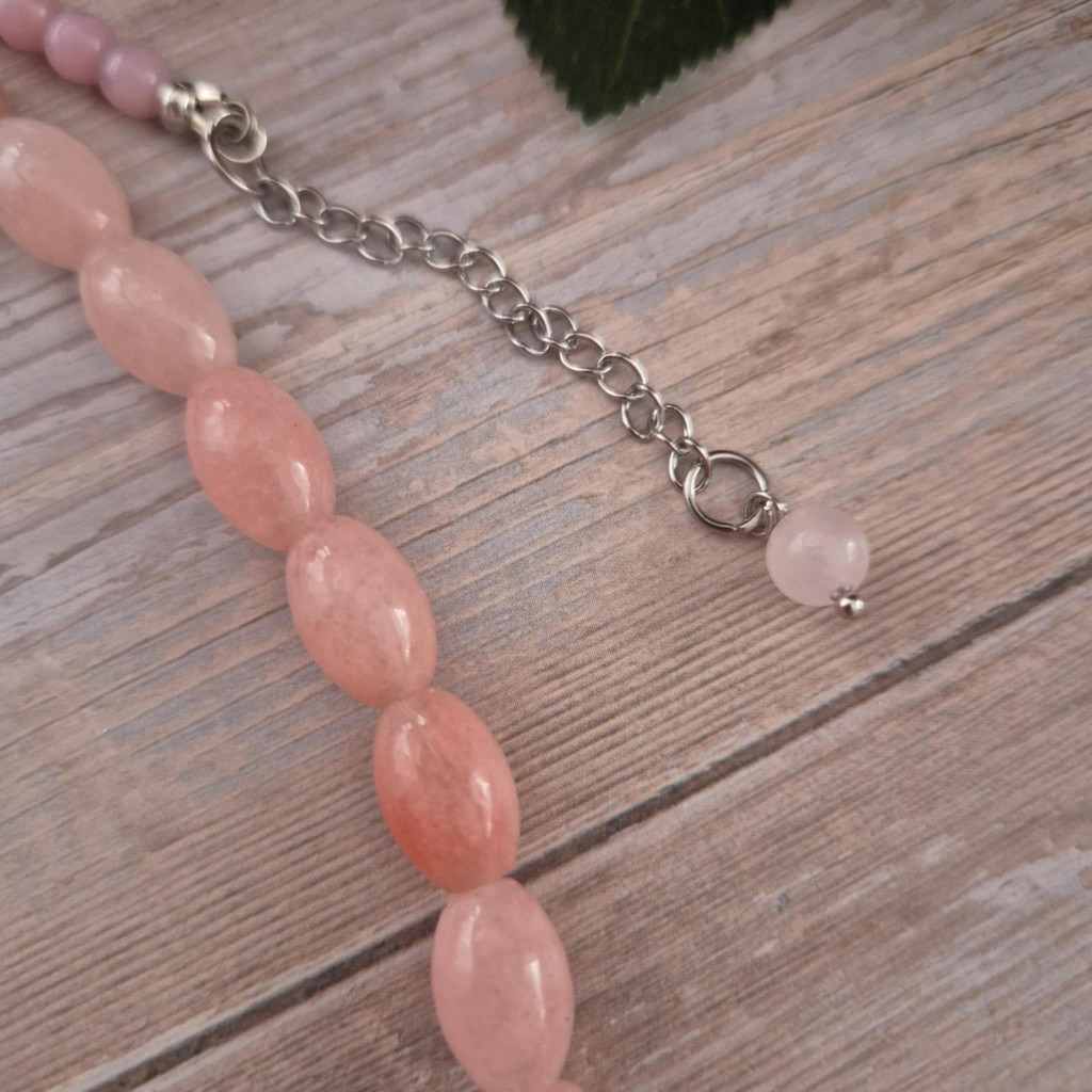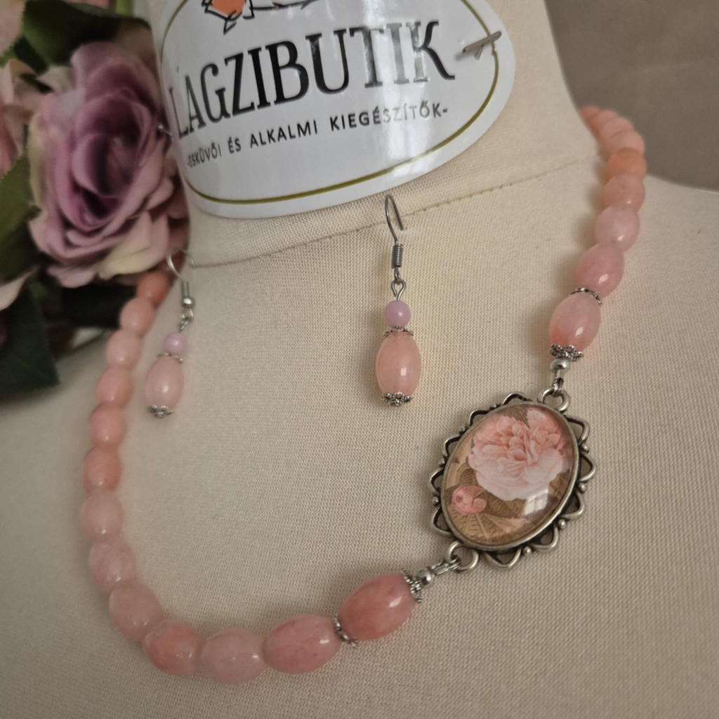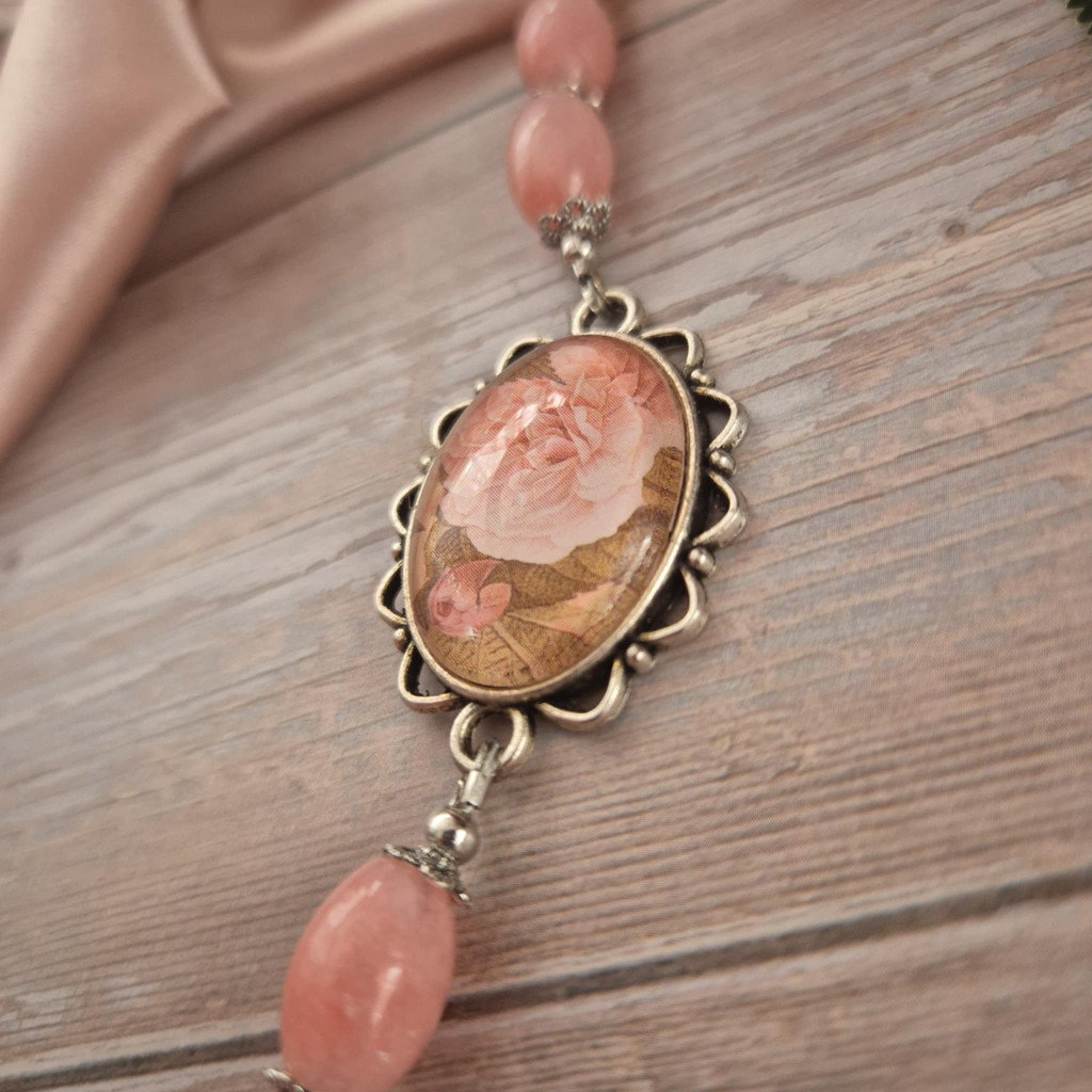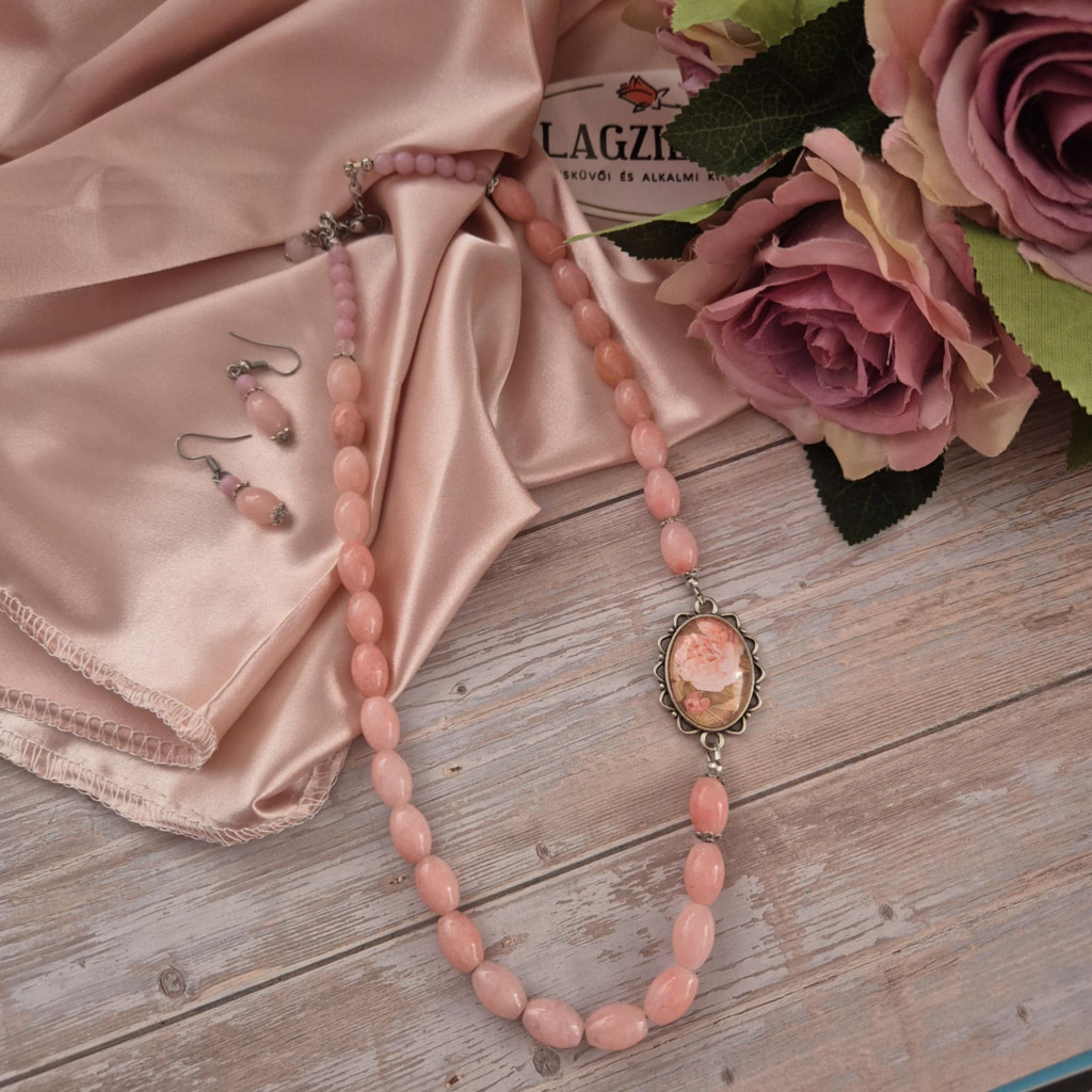 Rózsaszín, ovális, kb. 1 cm-es gyöngyszemekből készített nyaklánc, vintage stílusú rózsás fém kiegészítővel, domború üveggel.